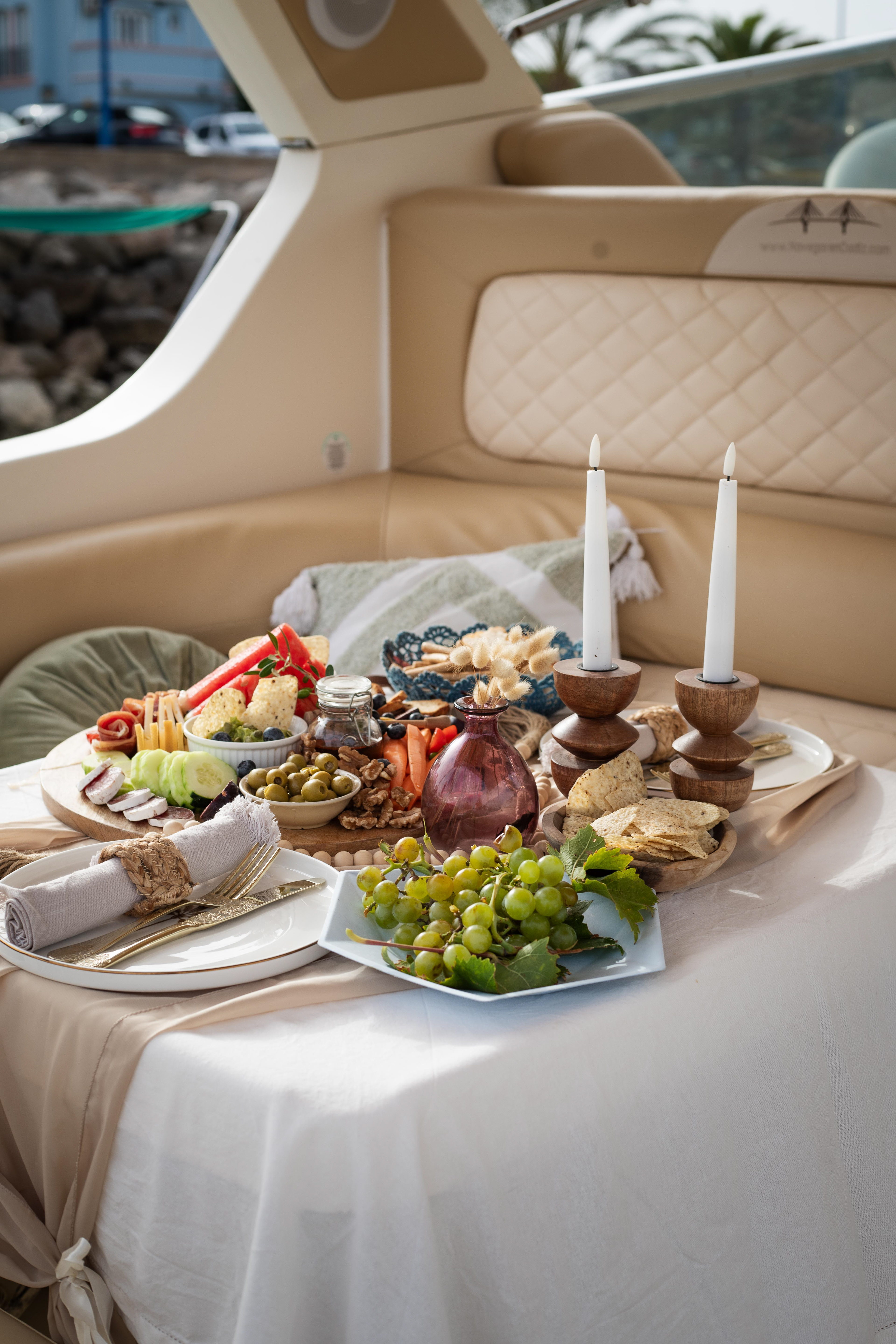 Instead of bringing in a separate table, we embraced the boat’s own table as the centerpiece of the design. We styled it with soft neutral linens, elegant tableware, and delicate touches of décor that elevated the setting while blending naturally with the boat. Cushions and cozy throws were added to ensure comfort, and fresh seasonal flowers brought a pop of romance. As the sun began to dip lower, lanterns and candles were placed to create a soft golden glow that matched the colors of the horizon.
