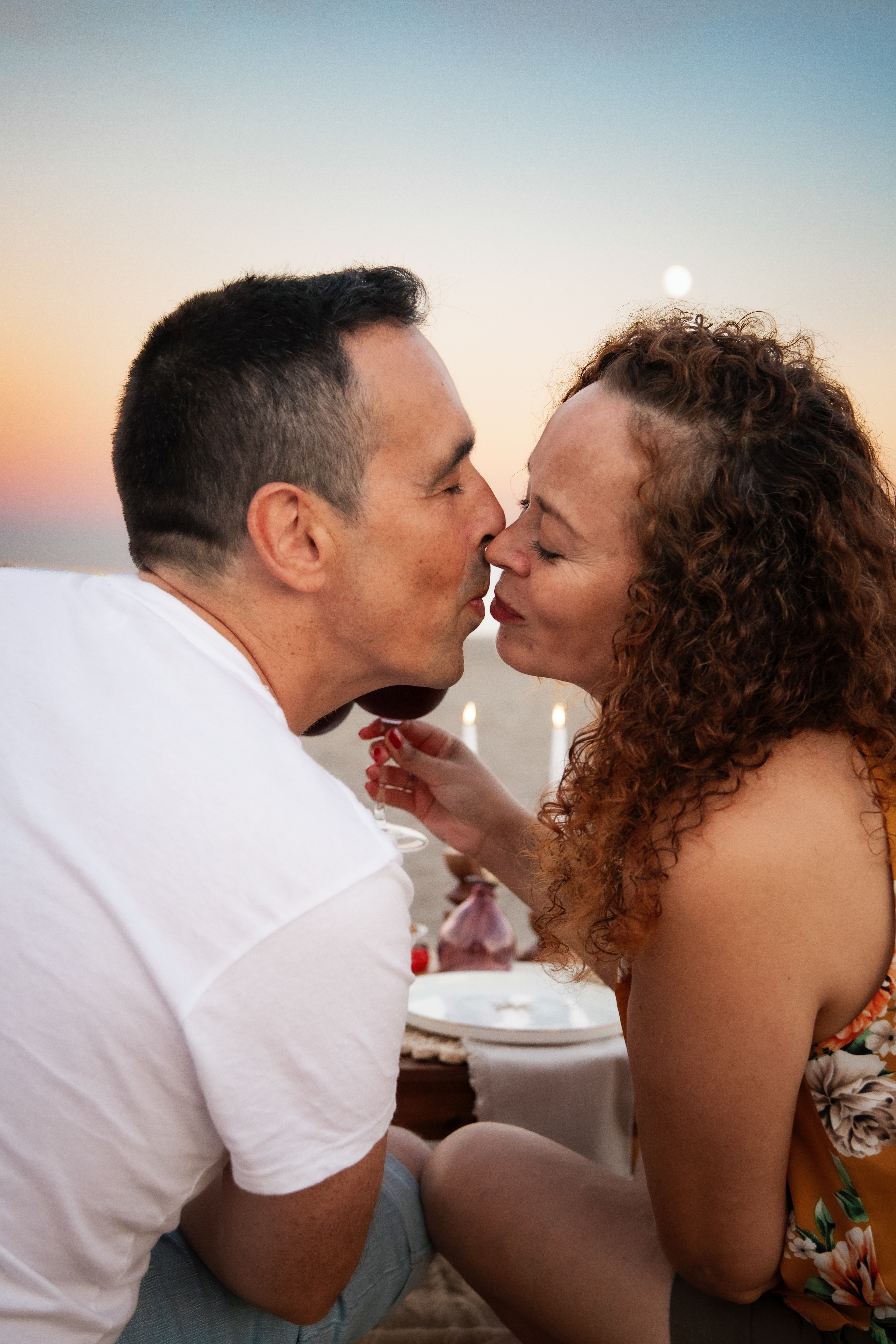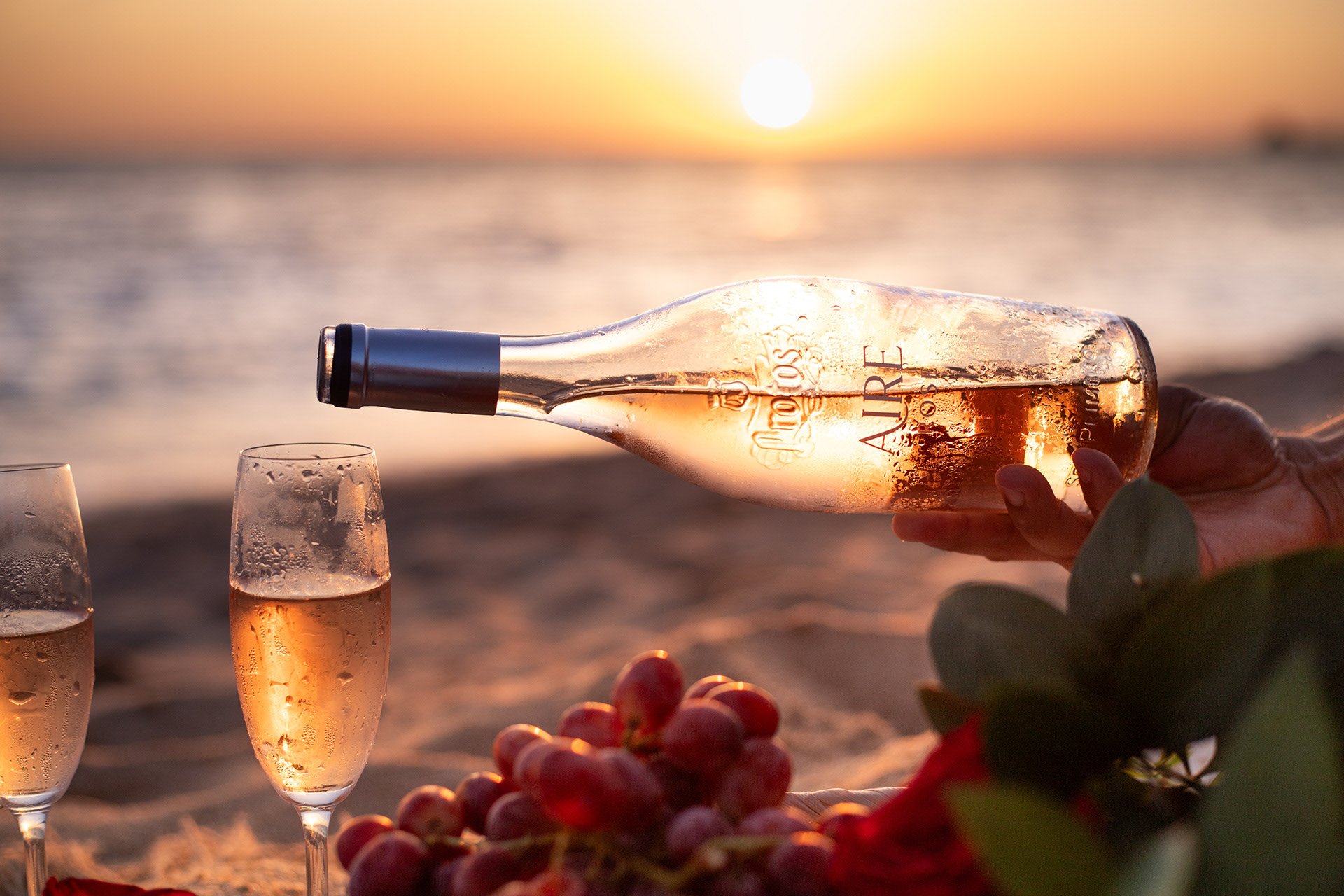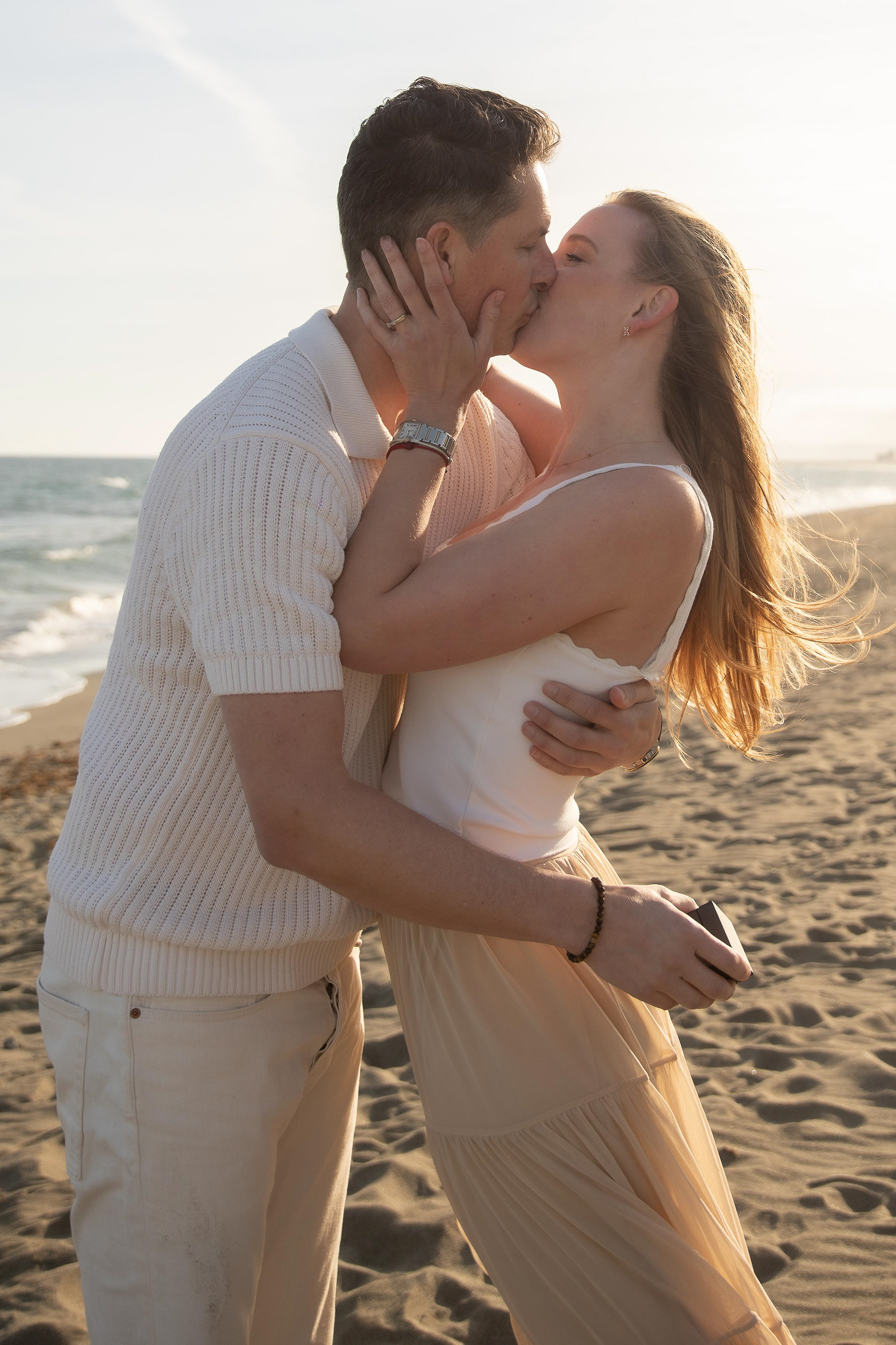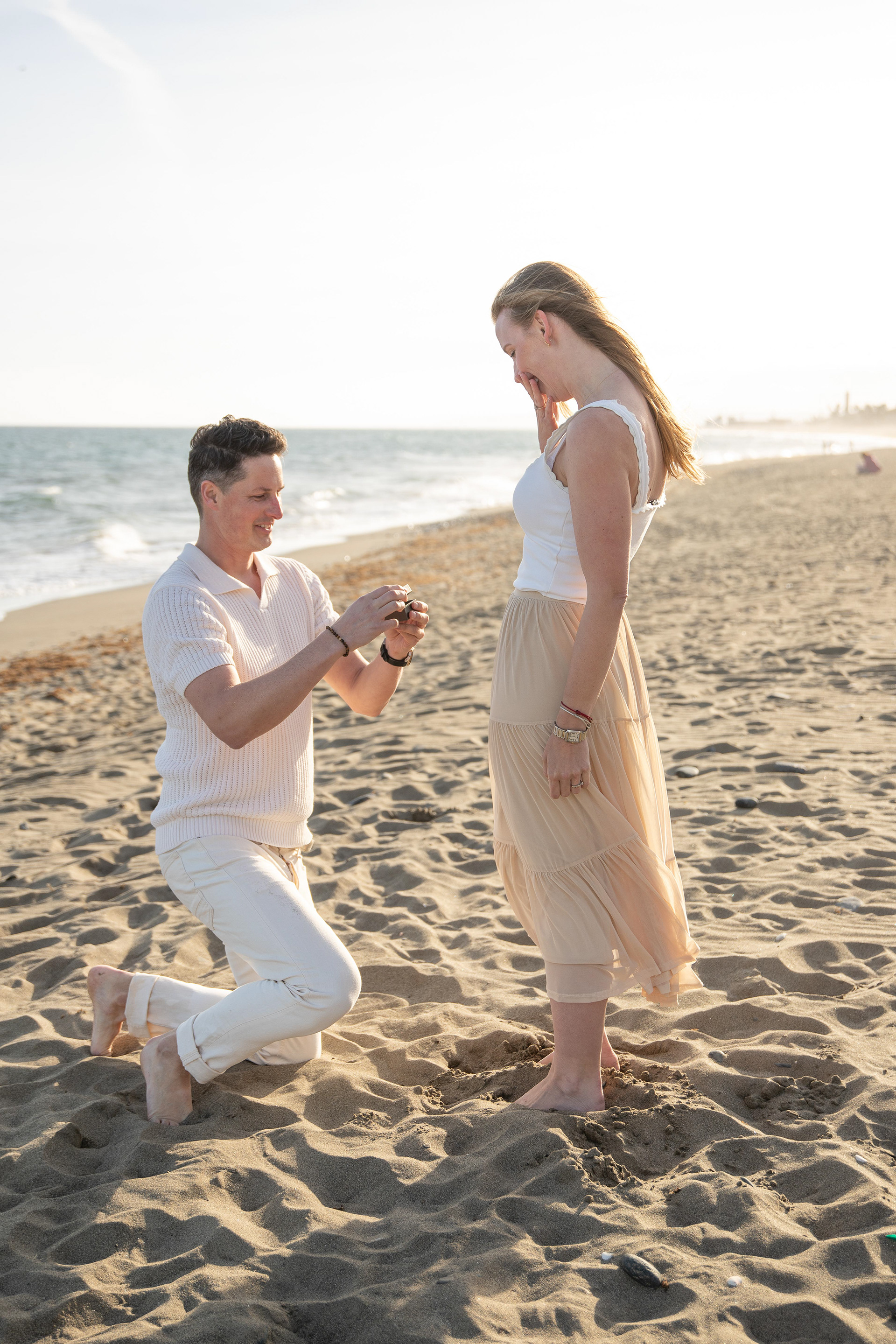 A barefoot moment on the sand, a sunset picnic set-up, champagne on ice, and a ring sparkling in the warm Atlantic light.