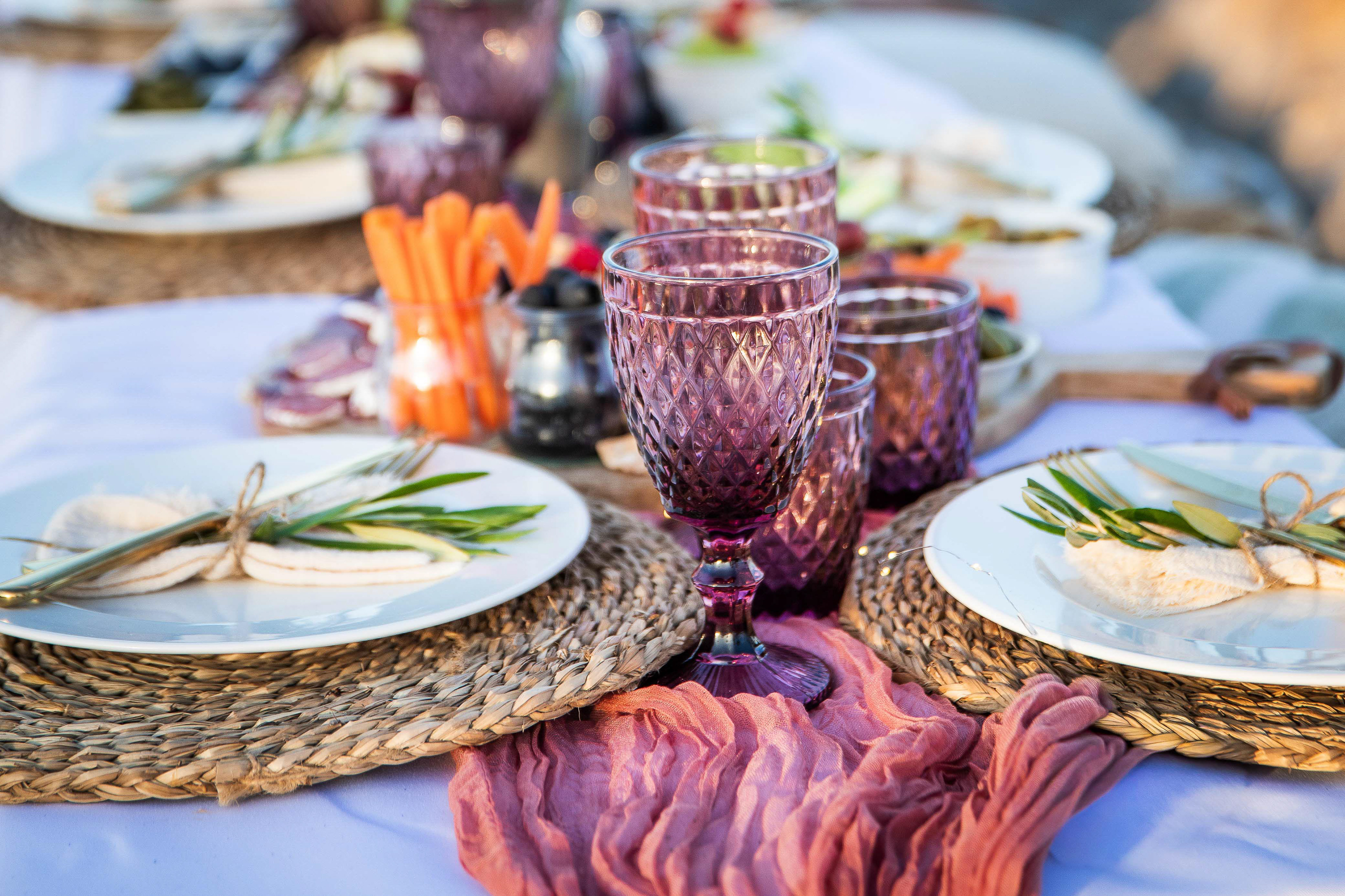 Una mesa baja elegantemente decorada, cojines mullidos, flores frescas cuidadosamente elegidas, velas que empiezan a brillar con la caída del sol, copas preparadas, detalles pensados al milímetro.
